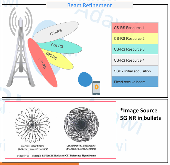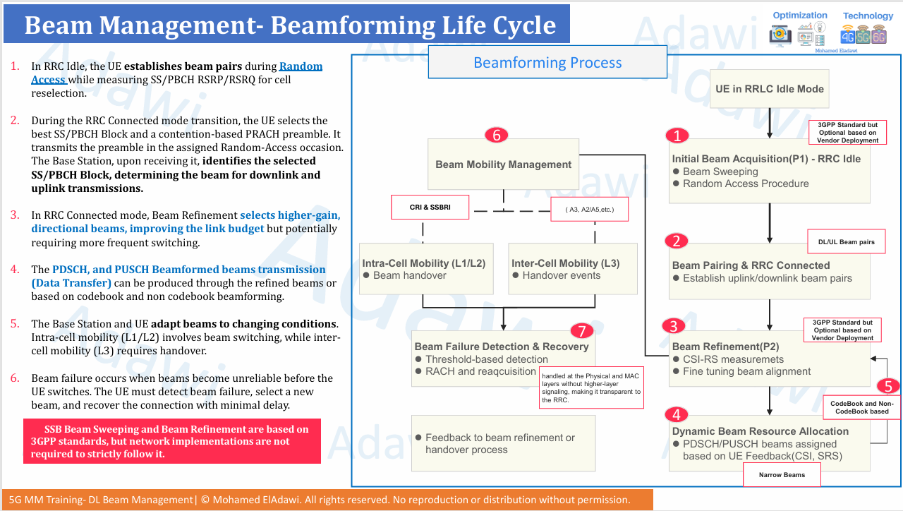 - 5G beam management starts with SSB-based initial acquisition, then moves to beam pairing, CSI-RS refinement, and finally traffic beam allocation.