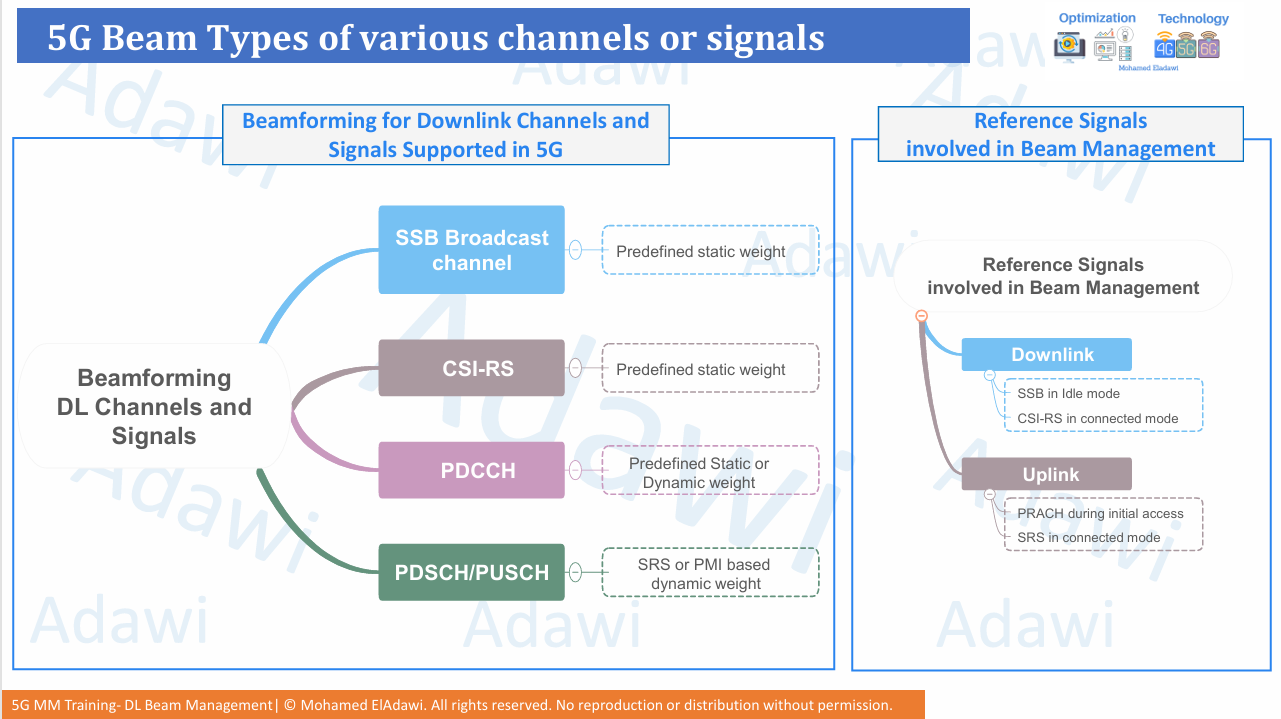 - PDSCH/PUSCH -> traffic beams, usually dynamic and based on CSI or SRS