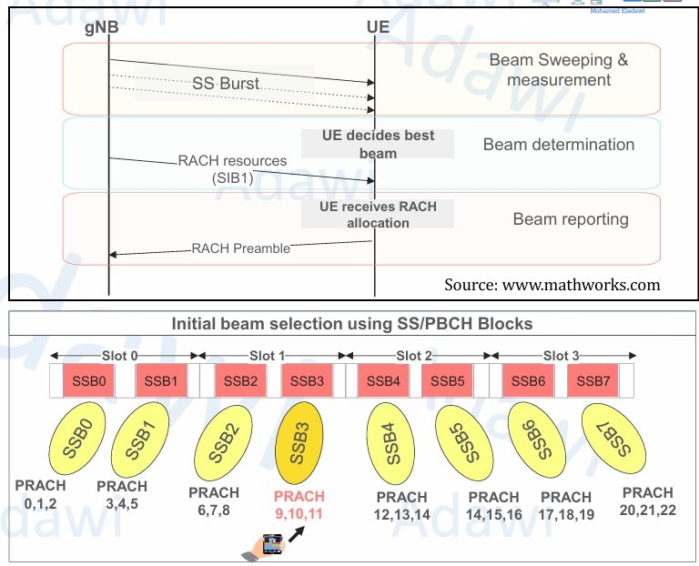 The UE then sends a PRACH preamble. Since the gNB already knows which PRACH resources are associated with which SSB, it can infer which SSB beam the UE selected. This is how the network identifies the initial beam pair.