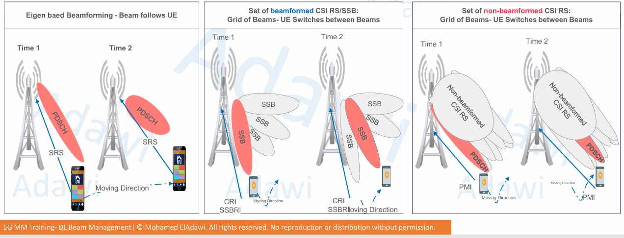 In Eigen-based beamforming, the beam follows the UE more dynamically. The gNB uses SRS-based uplink measurements and channel reciprocity to estimate the downlink channel, then updates the beamforming weights accordingly.