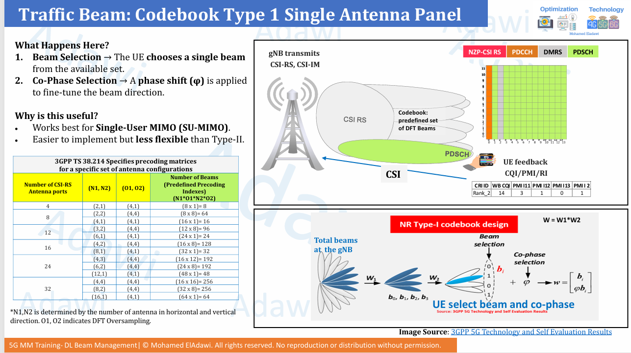 | Codebook type | Selects the feedback/reporting method | RRCReconfiguration / UE capability | Type I is simpler and common for SU-MIMO; Type II is richer and better for MU-MIMO |