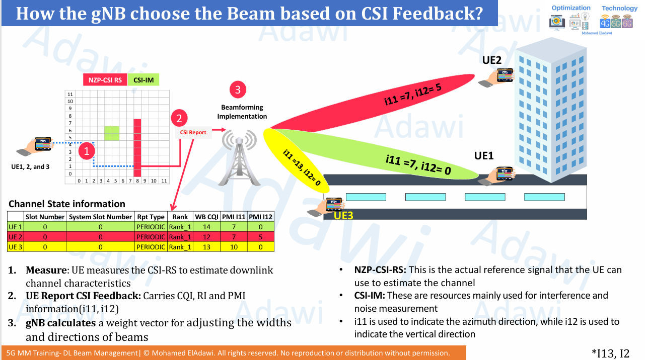 PMI i11 / i12 | Beam direction information reported by the UE | CSI report / logs | i11 is commonly linked to azimuth and i12 to elevation in practical interpretation |