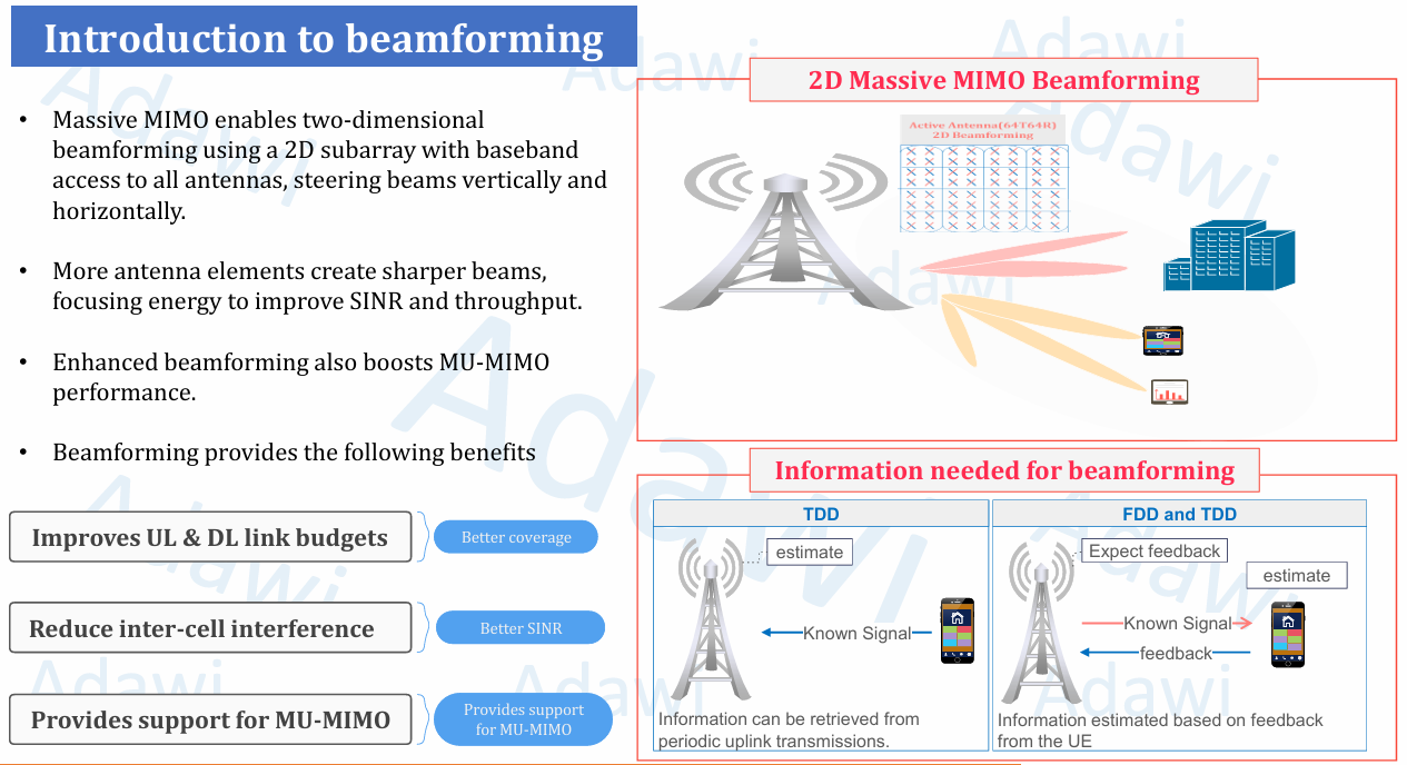 Another key advantage is 2D beamforming. In 5G Massive MIMO, the beam can be controlled in both the azimuth and elevation domains. This is especially useful in dense urban areas and high-rise environments.