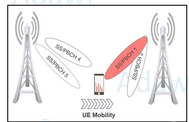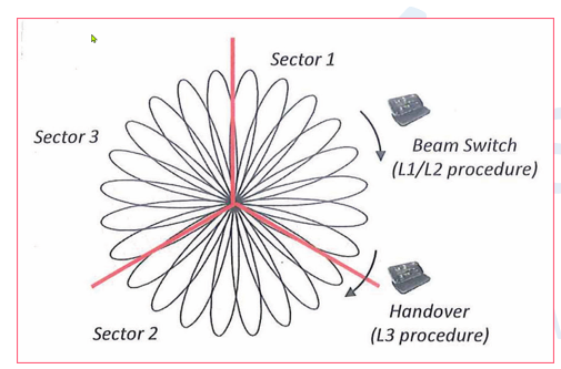 - Intra-cell mobility occurs when the serving beam of a UE is changed within the same sector, for example when switching between different SSB beams (e.g., among 8 supported SSBs) of the same cell.