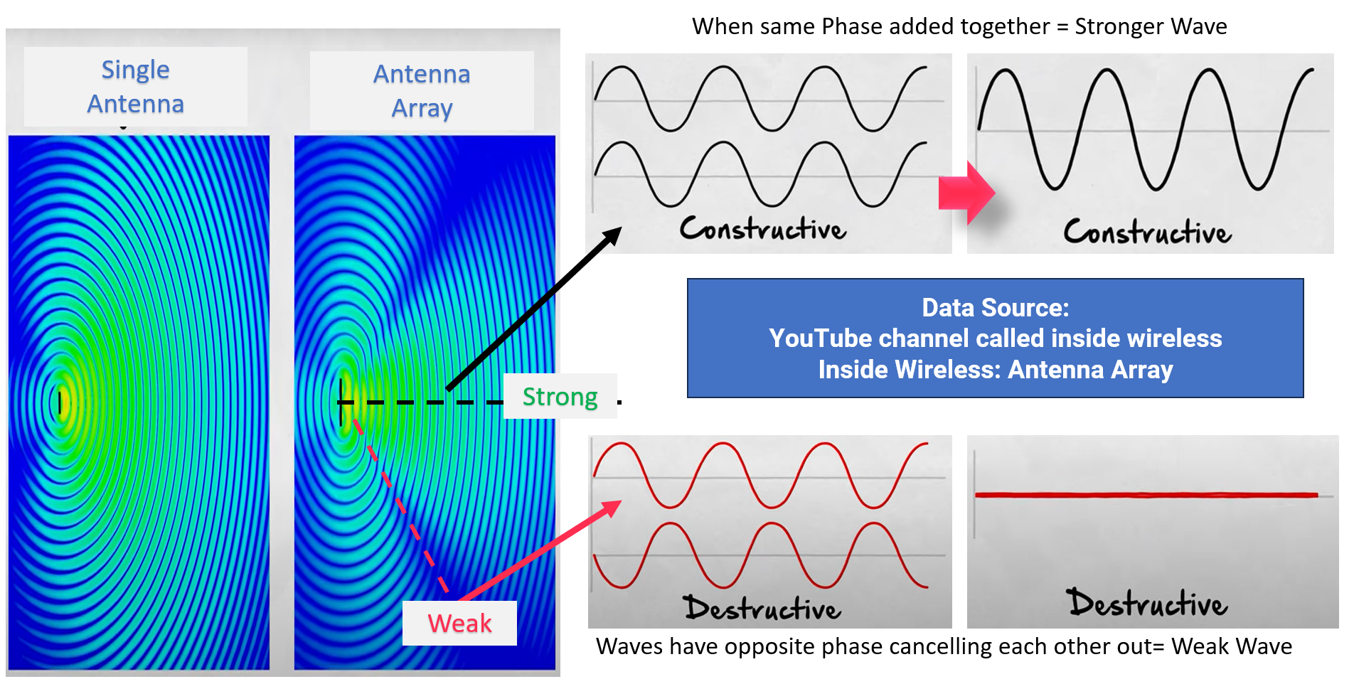 When signals from multiple antenna elements are added with the right phase relationship, they reinforce each other in the desired direction. This is constructive interference, and it helps create a stronger main beam.