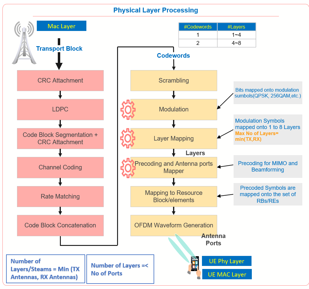 | Codeword | Encoded output used before modulation and layer mapping | PHY processing chain | 1 codeword can map to 1 to 4 layers, while 2 codewords can map to 4 to 8 layers |