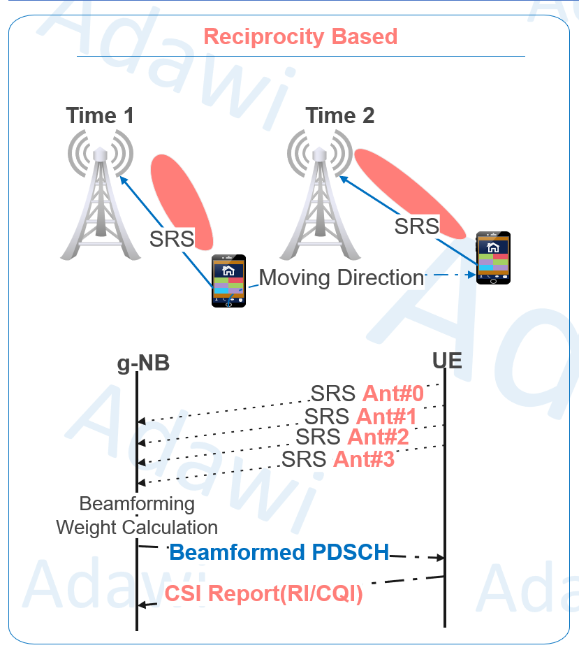 - Beamforming decisions are mainly guided either by reciprocity-based sounding through SRS or by codebook-based feedback through CSI-RS.