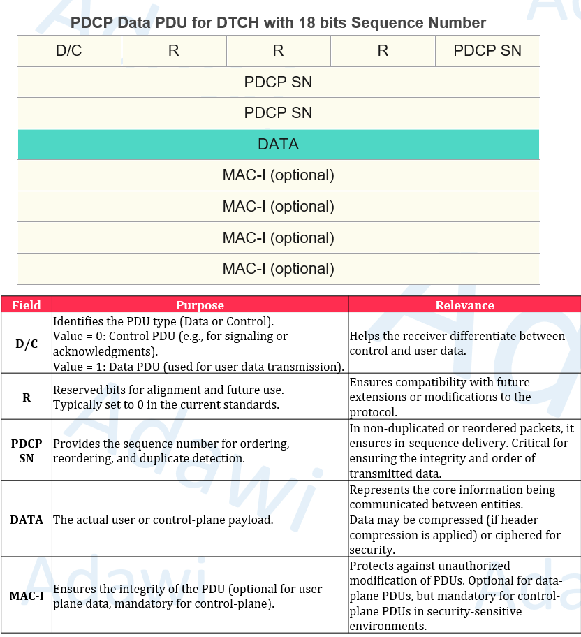 - PDCP adds a compact header (D/C, PDCP SN) and supports optional MAC-I for integrity/ciphering on DRBs.