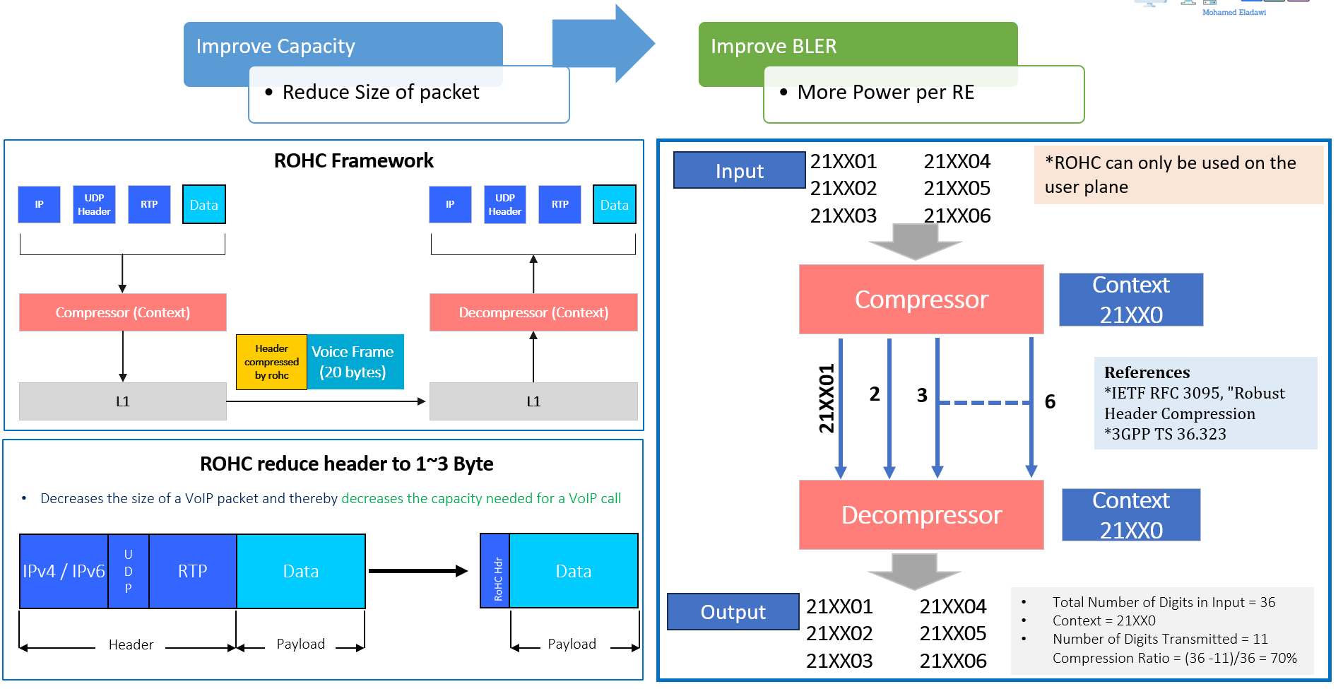 - ROHC can reduce header size significantly (1–3 bytes in the example), improving capacity.