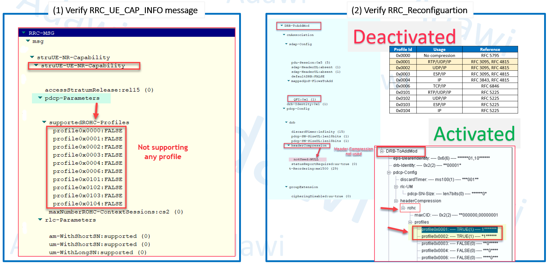 - UE capability message: verify the UE supports ROHC profiles