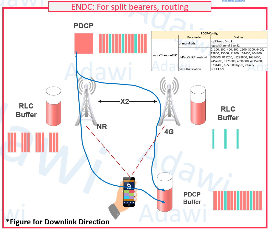 - In ENDC, the PDCP in the 5G node may route packets via X2 to RLC entities in the 4G node.