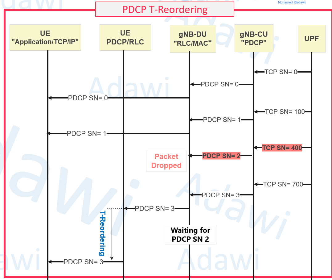 - SN 3 is delayed (buffered) while PDCP waits for SN 2 and starts t-Reordering.