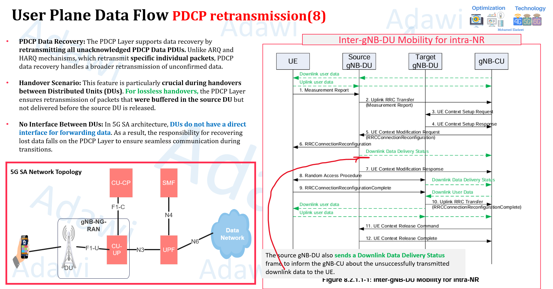 - In 5G SA architecture, there is no direct DU-to-DU interface for data forwarding, so PDCP handles recovery.