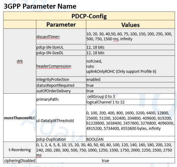 | pdcp-Duplication | Enable/disable duplication | PDCP-Config | Improves reliability but adds overhead |
