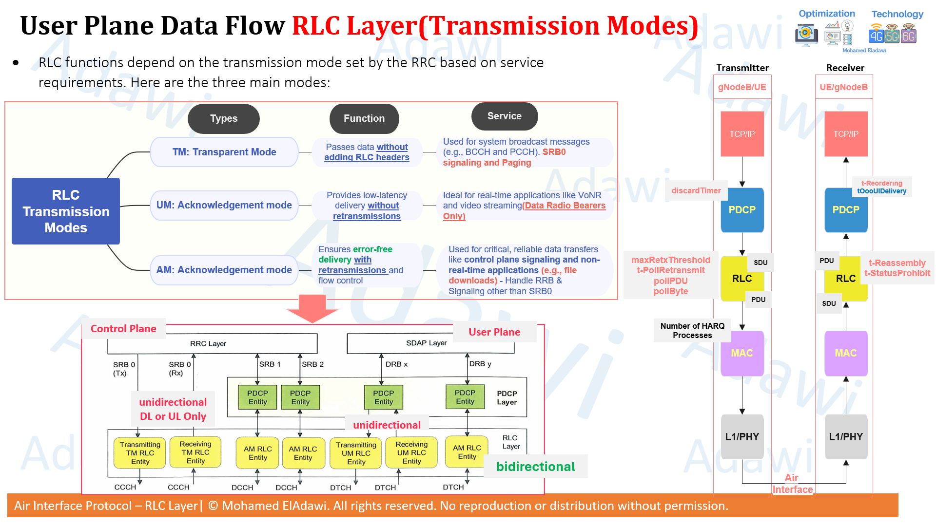 - Flow Control: RLC controls data flow to avoid MAC buffer overflow or underutilization.