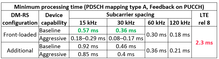 - Minimum baseline for 5G devices is ~0.36–0.57 ms, much lower than LTE Rel-8 which required around 2.3 ms.