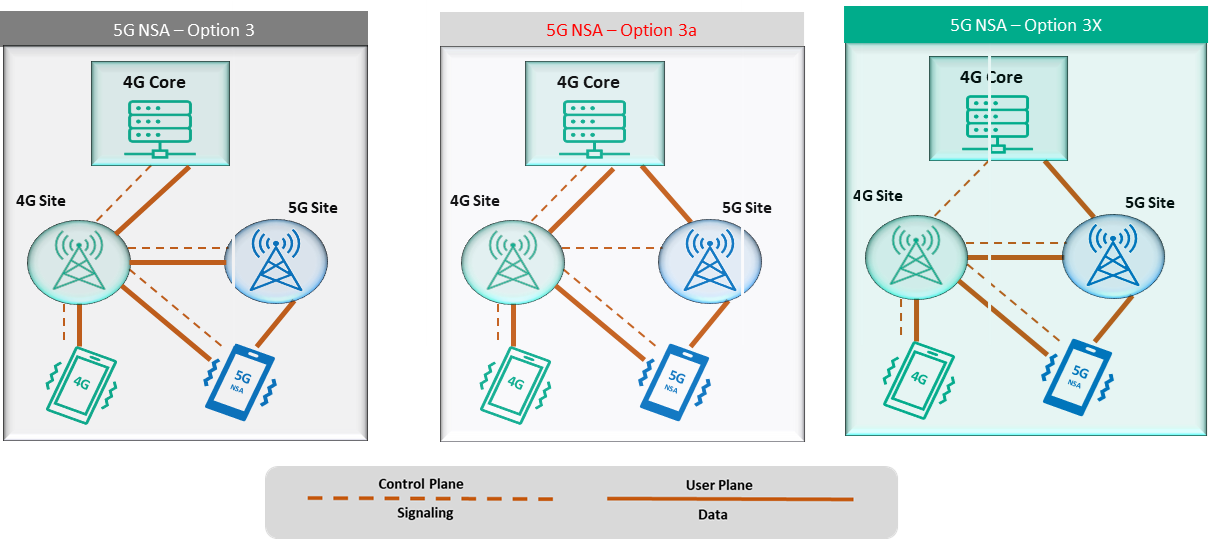5G NSA has mainly three options: Option 3, 3a, and 3X; Option 3x is preferred to overcome the drawback associated with options 3 and 3a. Let’s go through each option to understand it further.