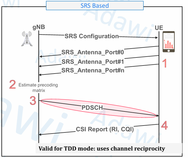 - The gNB measures the SRS and estimates the downlink propagation channel through channel reciprocity.