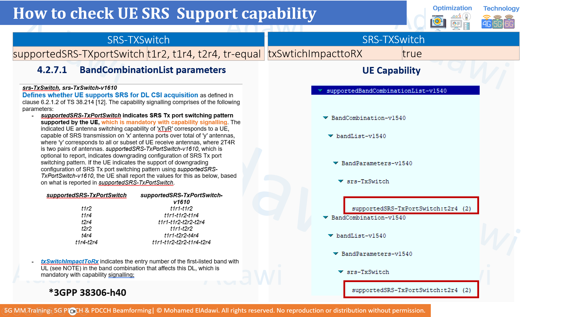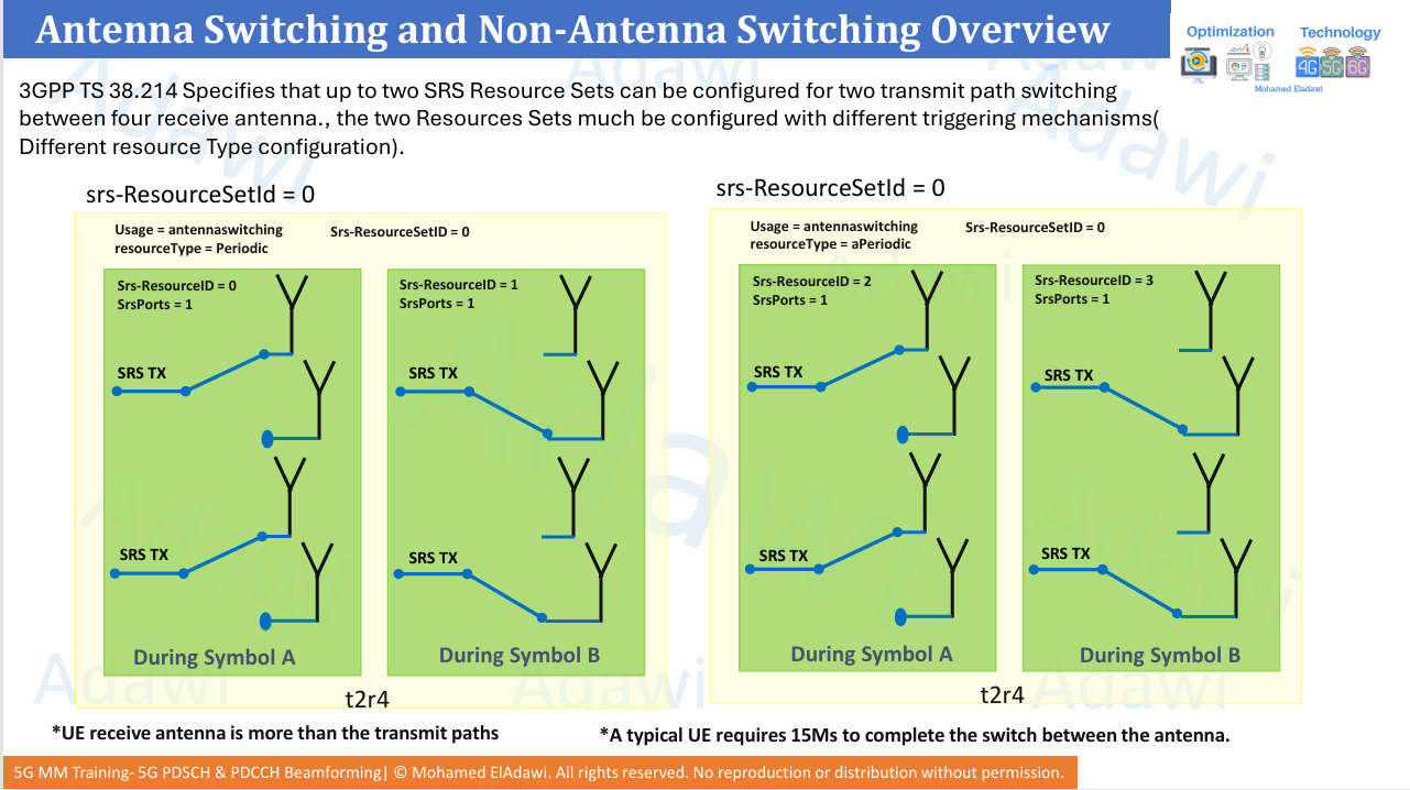- Antenna switching becomes essential when the UE has fewer TX paths than RX paths, such as 2T4R.